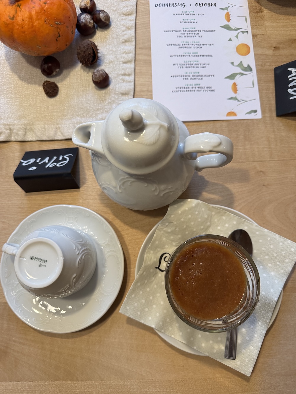 Die tägliche Energiezufuhr ist auf 300 Kalorien beschränkt. Es gibt keine feste Nahrung, keinen Zucker, kein Koffein und natürlich keinen Alkohol. Dreimal am Tag gibt es feste Essenszeiten, an denen das Essen serviert wird. Dazwischen hat man immer die Möglichkeit sich an einem „Buffet“ im Gesellschaftsraum zu bedienen. Flüssig versteht sich: Wasser (still, medium, prickelnd), zahlreiche Teesorten, und ggf. Suppenpulver oder Kakao (mit Wasser), falls man mal eine kleine Ergänzung braucht. Schlankzucker, bzw. Flohsamenschalen zur Verdickung stehen ebenso zur Verfügung. Morgens gibt es zum Beispiel: Kefir mit Birne, gelöschtes Joghurt mit Datteln oder ähnliches. Zu Mittag steht meistens ein Mus am Speiseplan: in unserem Fall zum Beispiel Apfelmus oder Ananas-Kiwi-Mus. Abends genießen wir stets mit Vorfreude eine warme, gebundene Suppe: Broccoli, Tomate oder Zucchini sind in unserer Fastenzeit die Geschmacksrichtungen. Jedes Hauptgericht wird langsam mit einem kleinen Löffel gespeist und richtig zelebriert. Zu jeder Mahlzeit gibt es ein Kännchen Tee. Stets ein anderer und immer abgestimmt.