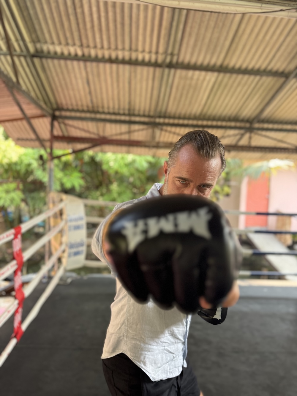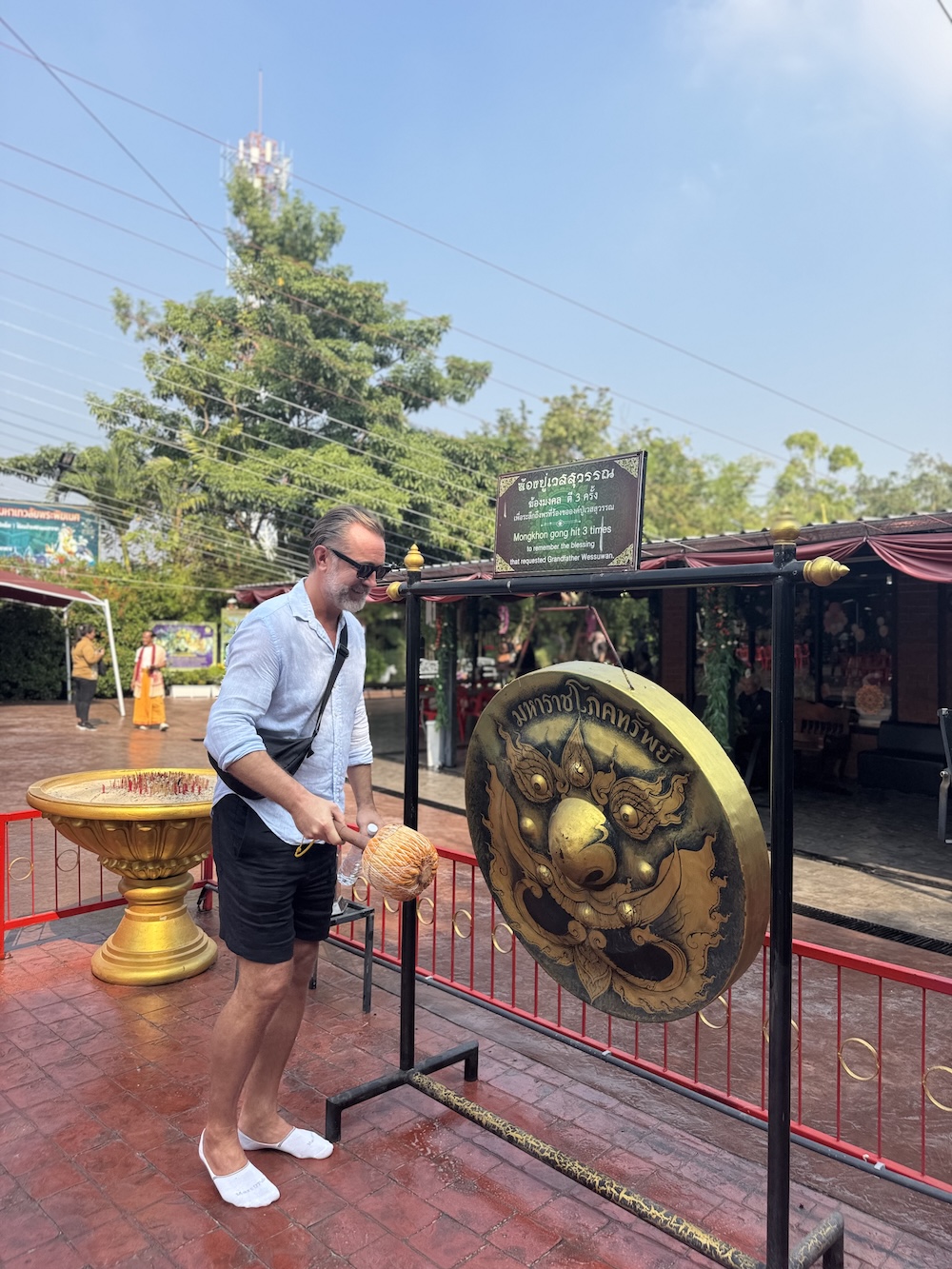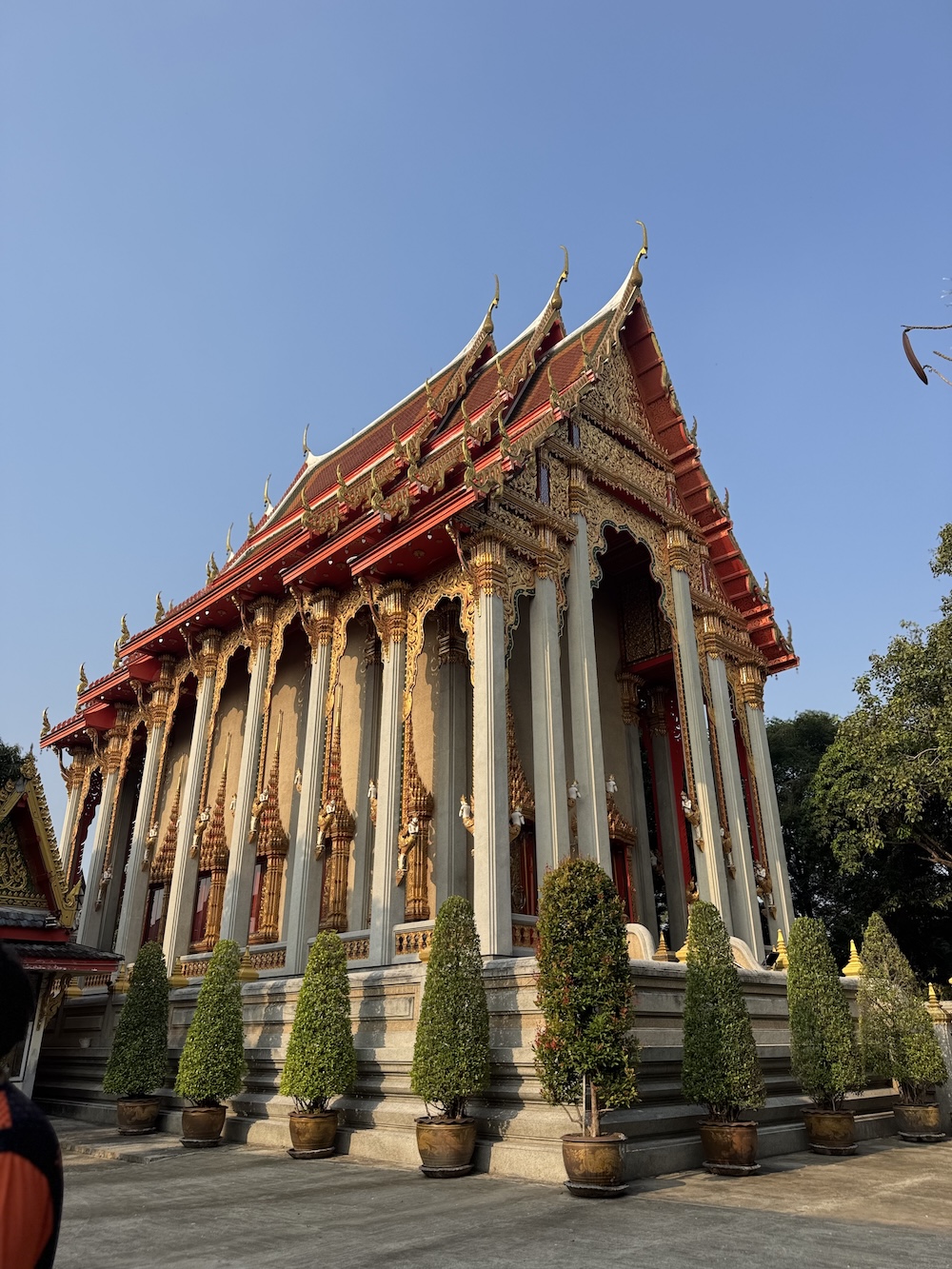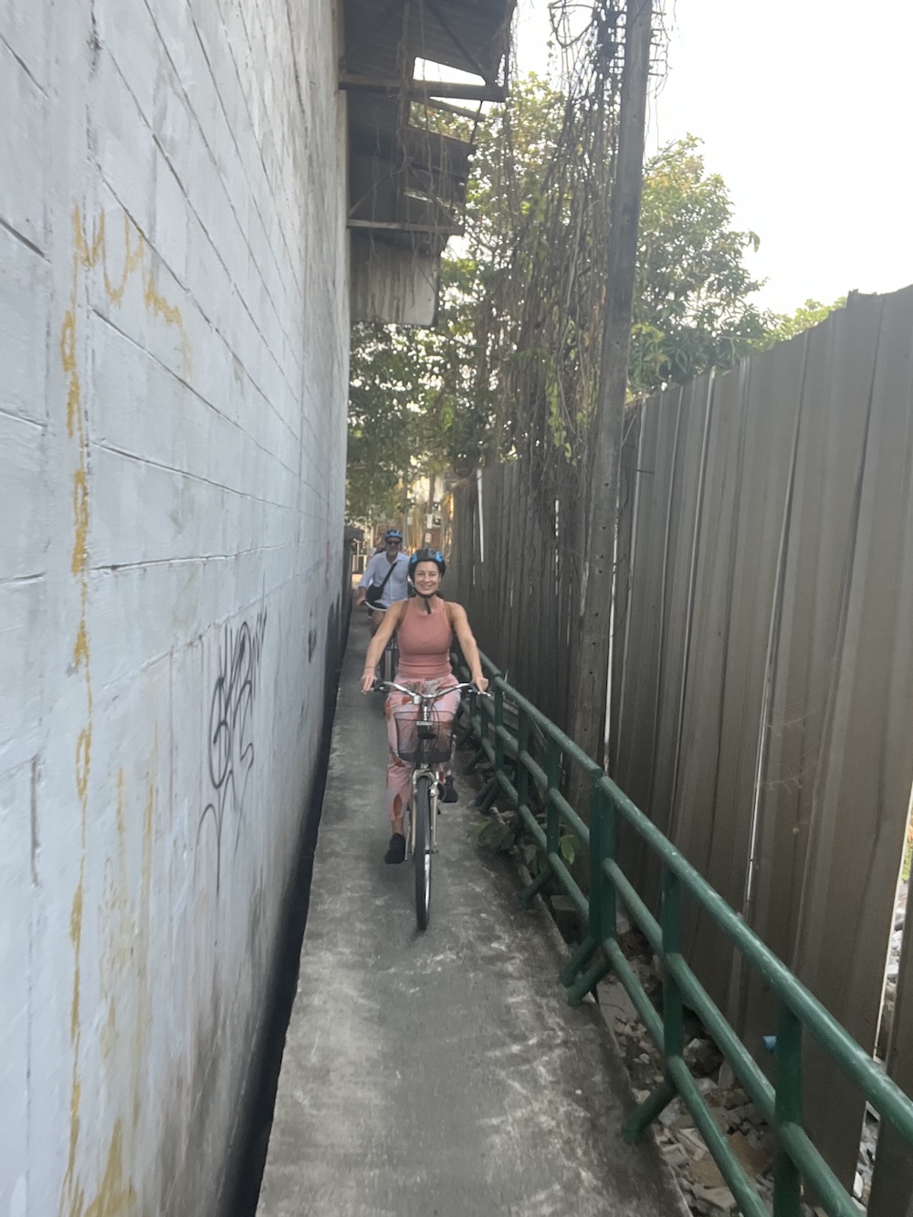 Bei dieser Biketour gilt: Der Weg ist das Ziel, wobei auch die vielen Einzelziele wirkliche Highlights sind. Die insgesamt ca. 15 km lange Tour führt uns entlang von Kanälen, durch Communities, durch den Dschungel und vorbei an spannenden Plätzen und interessanten Menschen. Manchmal radelt man fast durch die Wohnzimmer der Bewohner Bang Krachaos. Der erste Stopp ist ein kleiner, aber sehr sehenswerter Tempel – Wat Pariwat. Stünde dieser im Zentrum Bangkoks, wäre er bestimmt gut besucht. Hier allerdings sind wir sechs Bike-Tour-Teilnehmer die einzigen Besucher. Guide Alexander erklärt uns auf pfiffige Art und Weise Wissenswertes und – selbst für uns Thailand-Erfahrenen – immer wieder Neues. Auch in einem wirklich sehenswerten Hindutempel, ein weiterer Stopp im Rahmen der Biketour – erfahren wir von unserem Guide interessante und lustige Facts. Ein ganz besonderes Highlight ist der Besuch einer Thai-Boxing Schule, in der wir die Grundzüge dieses Sports erfahren- und vor den gestrengen Augen des Chefs auch ausprobieren dürfen. Wirklich sehr lustig und schweißtreibend. Der Wasserhaushalt kann aber permanent aufgefüllt werden – Wasser steht jederzeit kostenlos zur Verfügung. Den Abschluss bildet ein inkludiertes Mittagessen in einem traditionellen thailändischen Restaurant. Nur wer Lust auf ein Bier hat, muss dieses selbst bezahlen, der Rest ist inkludiert. Nach dem Essen geht´s wieder via Fähre und Pedalkraft zurück ins Headquarter.