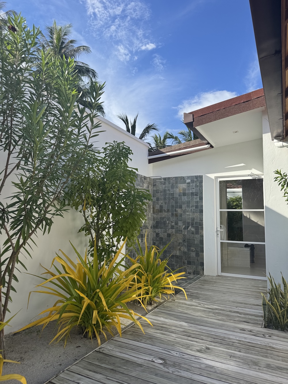 Schlaf- und Wohnzimmer können durch eine Schiebetür getrennt werden. Innen warm, elegant und gemütlich – außen nur ein paar Schritte bis zum Strand inklusive reservierter Sonnenliege. Die Deluxe Pool Villa ist nicht übertrieben opulent, sondern genau richtig: ein Rückzugsort. Der private Pool befindet sich hinten raus, umringt von farbenprächtigen Pflanzen und ist komplett durch Mauern abgeschirmt. Totale Privatsphäre damit garantiert. Das Badezimmer ist halb draußen, halb drinnen – mein persönlicher Lieblingsmix. Vorne auf der Veranda befindet sich eine kleine Fußdusche um den Sand von den Füßen waschen zu können: sehr aufmerksam und zudem gibt es auch hier noch eine komplette Loungegruppe.