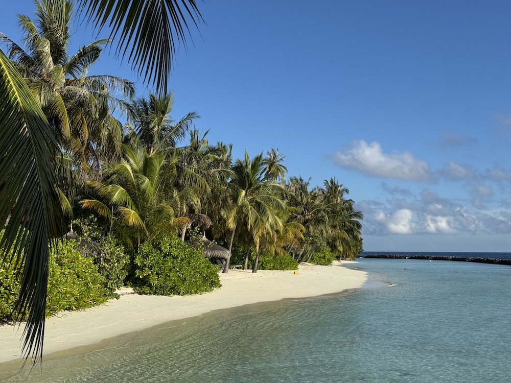 Ob die Nähe zu Malé Fluch oder Segen ist? Wer eine einsame, abgelegene Robinson-Crusoe-Fantasie sucht, wird auf Kurumba möglicherweise die Richtung ändern wollen. Wer aber einen kurzen, unkomplizierten Transfer, eine Insel mit einer üppigen und wunderschönen Vegetation (der Chairman und Gründer hatte bis zu seinem Tod ein Auge auf die Pflanzen und Blumen), traumhaften Stränden, wie aus dem Malediven-Lehrbuch und Blick auf die Skyline der Hauptinsel möchte, der ist auf Kurumba Maldives genau richtig. Die Wege sind schattig, die Gärten gepflegt, aber nie aufdringlich perfekt. Die Kokospalmen sind die heimlichen Herrscher über die Insel und über die Jahre beinahe ins unermessliche gewachsen. Rund um die Insel zieht sich ein Strand, der so hell ist, dass man geblendet ist und ja – das Meer kommt in Farbstufen, die jede Farbpalette neidisch machen.