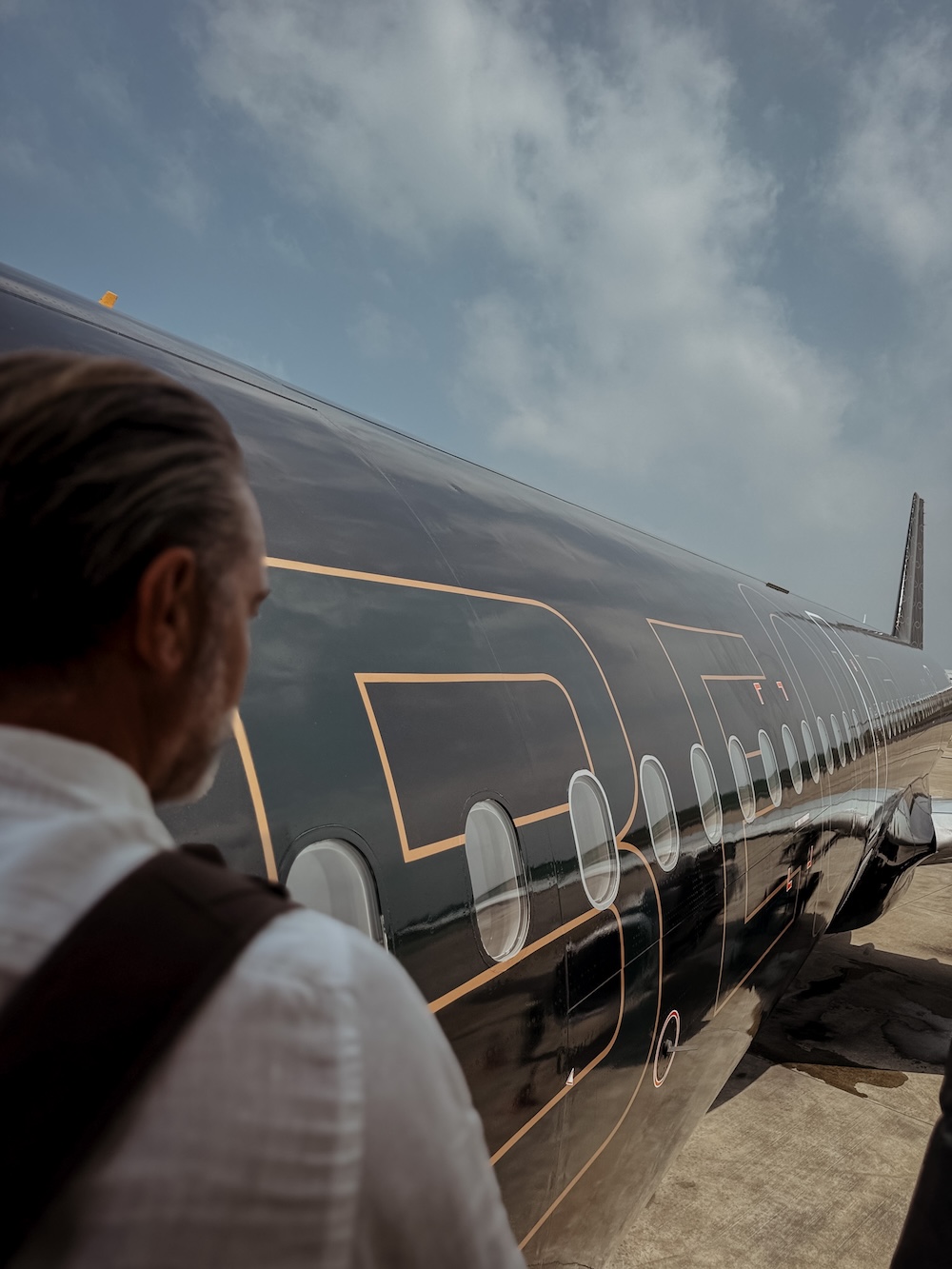 Der Urlaub beginnt nicht erst auf der Insel – sondern schon beim Einsteigen, nein eigentlich schon beim Check-in am Flughafen. Maximal 44 Passagiere pro Flug – das spürt man sofort. Check-in? Schnell. Persönlich. Entspannt. Danach geht es über den Fast Track direkt in die Lounge (Zugang ab BLISS Kategorie inkludiert) – ein kleines Ritual der Vorfreude, bevor die Reise richtig beginnt. Das Boarding erfolgt per Bus – und dann steht sie da. Die Maschine in tiefem Schwarz mit kupferfarbenen Akzenten. Außen cool und mondän, innen warm und elegant: Beige und Weiß, Akzente in Kupfer, weiche Lichtstimmung, dezentes Branding.