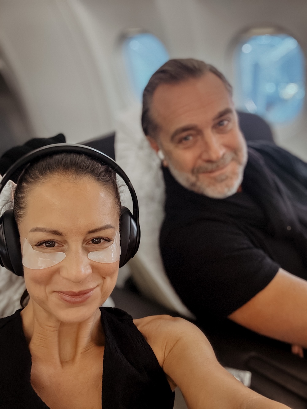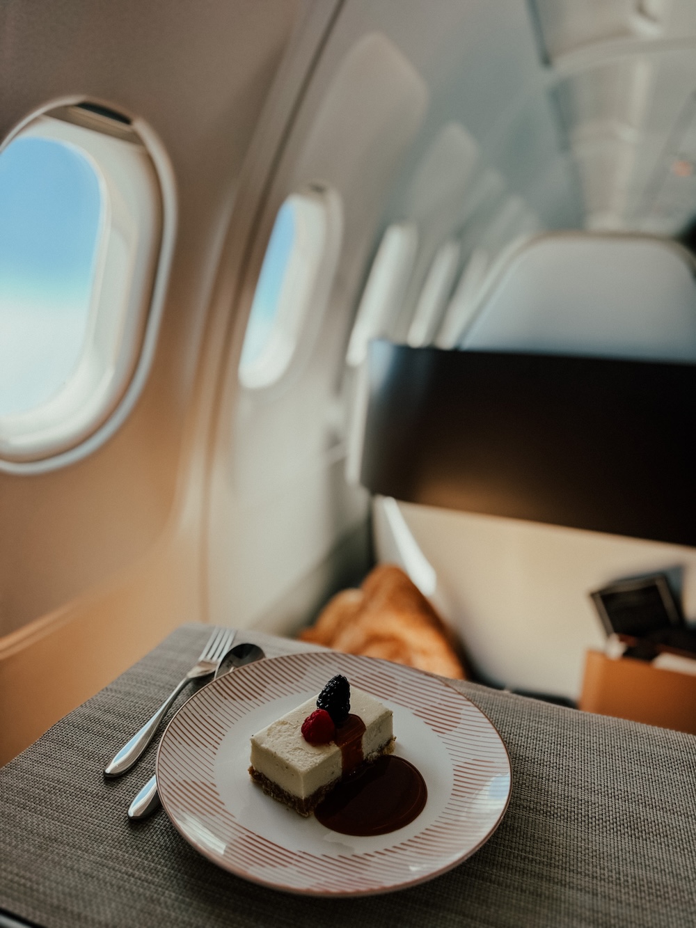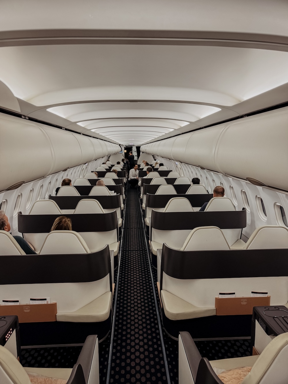 Es gibt keine Klassenunterschiede – hier fliegen alle gleich komfortabel. Es sind ausschließlich Business-Class-Sitze – Full-Flat Liegesitze – in einer 2-2 Konfiguration, mit hochwertigem Leder verarbeitet. Jeder Sitz kann zum Bett umgewandelt werden inkl. Topper auf Wunsch für extra Schlafkomfort. Ja, der Fußraum könnte etwas großzügiger sein, und Stauraum gibt es nicht im Überfluss – aber ehrlicherweise fühlt sich die Atmosphäre insgesamt näher am Privatjet an als an einer klassischen Linienmaschine. Und für uns zählt das Flatbed. Denn seien wir uns ehrlich: mehr Ablagefläche macht einen 12-stündigen Flug nicht angenehmer.