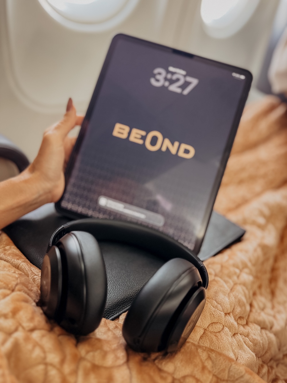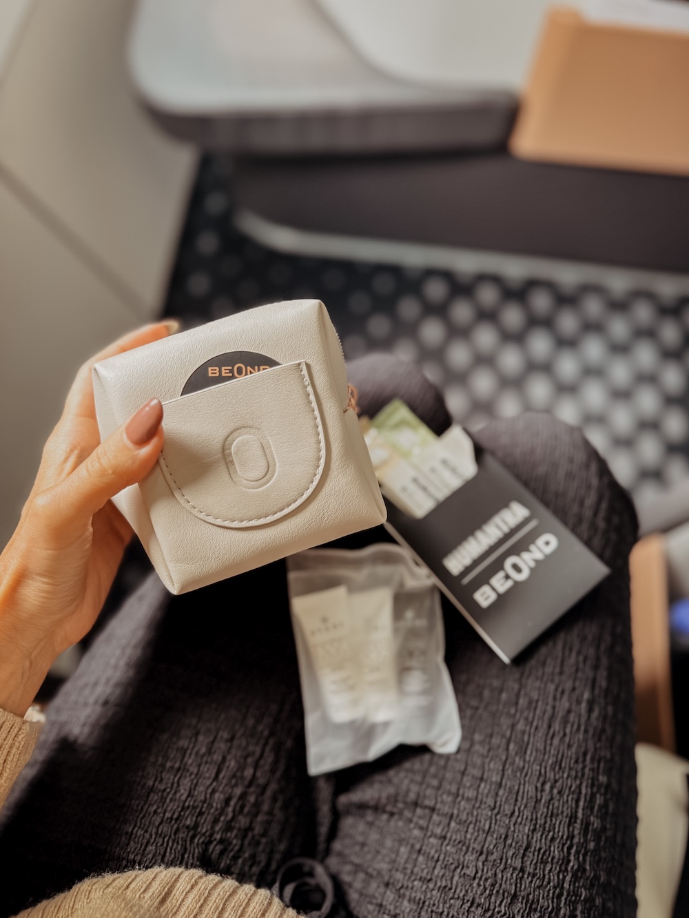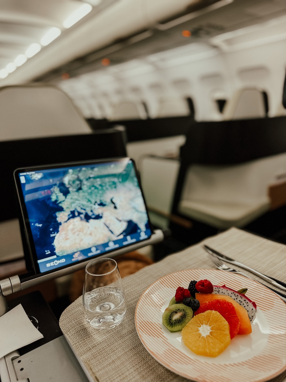 Detox beim Fliegen? Ja das geht. Im Amenitykit von beOnd finden sich super weiche, außerordentlich gut gepolsterte Schlafmasken, Elektrolytgetränke sowie feuchtigkeitsspendende Augen- oder Gesichtsmasken. WIFI gibt es keines an Bord, von daher gibts Digital Detox on top. Für Entertainment ist aber gesorgt und zwar mittels iPad, das jedem Passagier eingepackt in einer edlen Lederhülle mit den dazugehörigen Apple Kopfhörern für den Flug ausgehändigt wird.