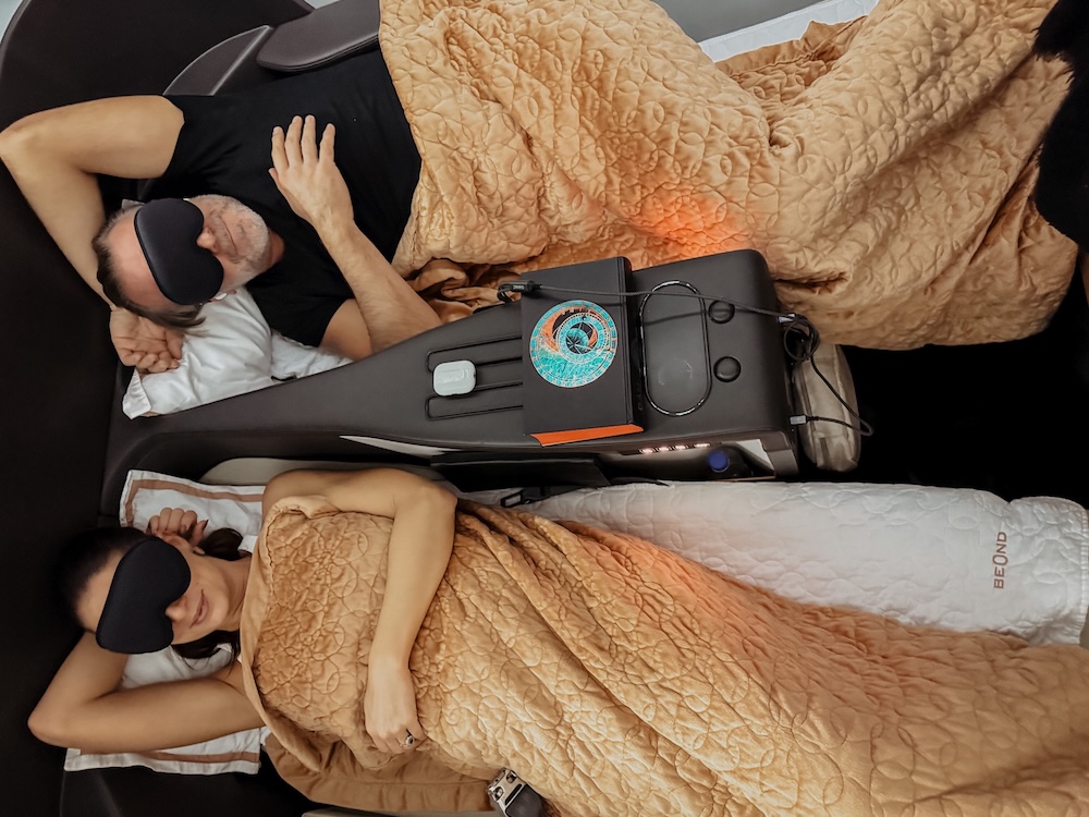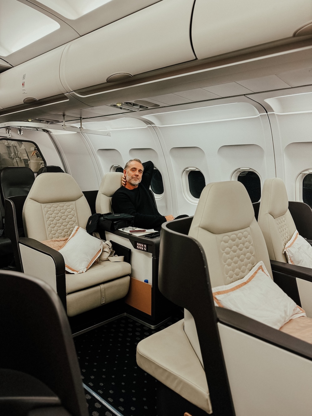 Es gibt keine Klassenunterschiede – hier fliegen alle gleich komfortabel. Es sind ausschließlich Business-Class-Sitze – Full-Flat Liegesitze – in einer 2-2 Konfiguration, mit hochwertigem Leder verarbeitet. Jeder Sitz kann zum Bett umgewandelt werden inkl. Topper auf Wunsch für extra Schlafkomfort. Ja, der Fußraum könnte etwas großzügiger sein, und Stauraum gibt es nicht im Überfluss – aber ehrlicherweise fühlt sich die Atmosphäre insgesamt näher am Privatjet an als an einer klassischen Linienmaschine. Und für uns zählt das Flatbed. Denn seien wir uns ehrlich: mehr Ablagefläche macht einen 12-stündigen Flug nicht angenehmer.