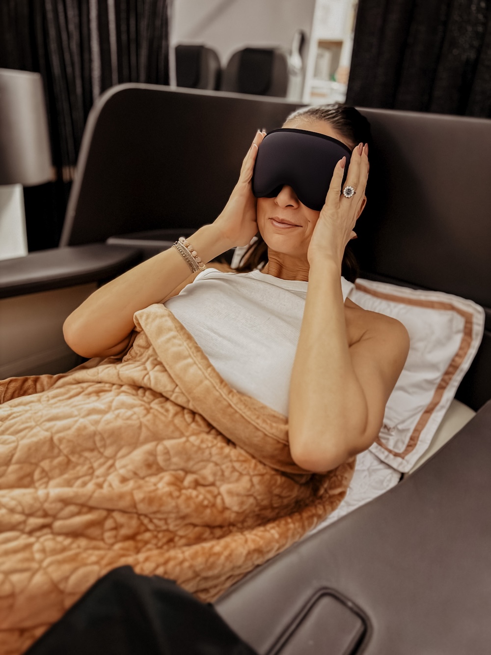 Der Urlaub beginnt nicht erst auf der Insel – sondern schon beim Einsteigen, nein eigentlich schon beim Check-in am Flughafen. Maximal 44 Passagiere pro Flug – das spürt man sofort. Check-in? Schnell. Persönlich. Entspannt. Danach geht es über den Fast Track direkt in die Lounge (Zugang ab BLISS Kategorie inkludiert) – ein kleines Ritual der Vorfreude, bevor die Reise richtig beginnt. Das Boarding erfolgt per Bus – und dann steht sie da. Die Maschine in tiefem Schwarz mit kupferfarbenen Akzenten. Außen cool und mondän, innen warm und elegant: Beige und Weiß, Akzente in Kupfer, weiche Lichtstimmung, dezentes Branding.